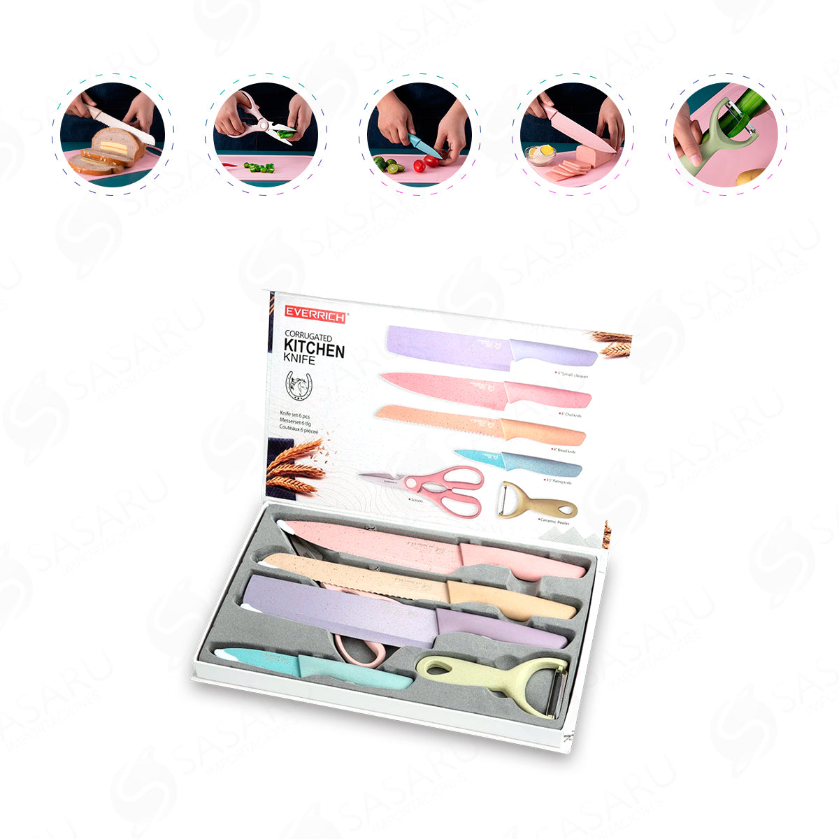 Juego de cuchillos 6 en 1: cuchillo de chef de 8 pulgadas, cuchillo de pan de 8 pulgadas, cuchilla pequeña de 8 pulgadas, cuchillo de pelar de 3,5 pulgadas, tijeras y pelador de cerámica.